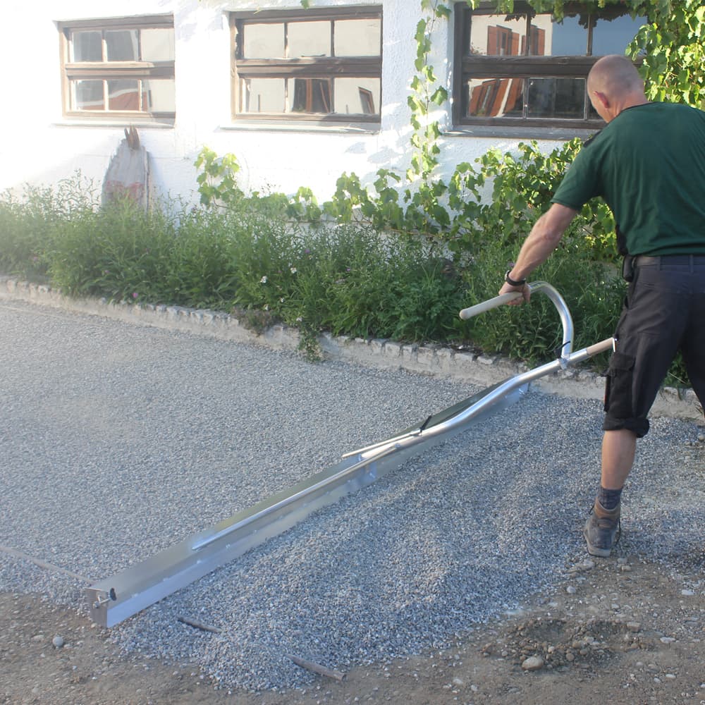 Mit zusätzlichen seitlichen Aufsetzrollen übertragen Sie die relevante Höhe ganz einfach von Bordstein oder Pflasterfläche auf das Profil des Planierfliegers und ersparen sich das zeitaufwendige Einbauen der Abziehlehre.